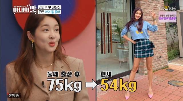 김빈우는 "75kg에서 다이어트를 시작했다. 9개월만에 21kg을 빼 현재 54kg이다"고 설명해 좌중의 놀라움을 자아냈다.