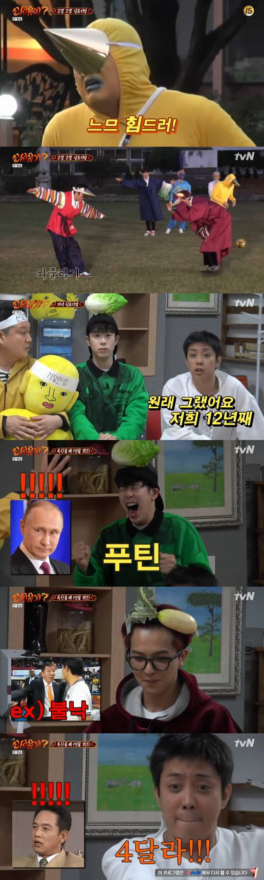 이후 멤버들은 가을 특산물을 걸고 저녁 식사 게임을 펼쳤다. 멤버들은 유독 약한 인물 퀴즈에 두려움을 드러냈지만, 뜻밖에도 정답 잔치가 벌어졌다. 특히 피오는 푸틴을 맞히며 트럼프의 한을 풀었다. 피오는 "내가 트럼프 안다고 하지 않았냐"며 큰소리쳤고, 송민호는 "너 트럼프 이제 다 씻었다. 난 여기서 끝났다고 생각했다"며 기뻐했다. 하지만 기쁨도 잠시, 마지막으로 남은 은지원이 설현을 맞히지 못해 생닭 획득에 실패했다.
