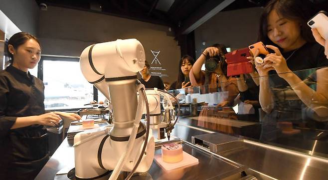 티로보틱스와 디스트릭트홀딩스가 73일 서울 성동구 아차산로에 합작 로봇 카페 '카페봇'을 오픈했다.