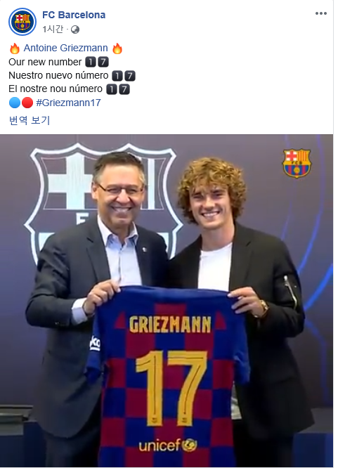 바르셀로나는 14일 공식 채널을 통해 그리즈만이 등번호 17번을 받았음을 알렸다.