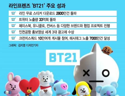 콘텐츠 회사가 아니라 글로벌 톱스타가 직접 크리에이티브 과정을 이끌었다는 점에서 이례적이다. 라인프렌즈의 시도는 적중했다. 2017년 9월 공개 직후 한국, 미국, 일본 등에서 판매한 BT21 캐릭터 상품은 연일 매진 사례를 기록했다. 지난해 9월 모바일메신저 라인을 통해 무료 스티커를 공개한 이후 다운로드는 2800만건을 돌파했고 트위터 내 BT21 노출량은 33억회를 넘었다. 페이스북, 유니클로, 안티 소셜 소셜 클럽, 제페토 등 글로벌 브랜드와 협업 프로젝트도 진행했다.