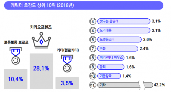 한국콘텐츠진흥원의 캐릭터산업백서에 따르면 지난해 국내 캐릭터 호감도 순위 1위는 카카오프렌즈(28.1%)다. 뽀로로(10.4%), 키티(3.5%) 등 2,3위 캐릭터와 비교해 압도적 우위다. 카카오프렌즈의 급성장 배경에는 모바일 메신저 플랫폼이 있다. 메신저를 통해 전 연령대 사용자에게 다가서면서 캐릭터 상품 구성도 완구·문구에서 벗어나 생활용품, 사무용품, 화장품 등으로 다양해진것.