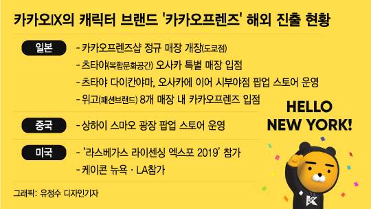 라이언, 어피치 등 카카오프렌즈 캐릭터가 해외로 발을 넓히고 있다. 모바일 메신저를 통해 국내 시장을 석권한 데 이어 철저한 현지화 전략으로 글로벌 승부수를 던졌다. 캐릭터 강국인 일본에 성공적으로 안착한 데 이어 중국, 홍콩 등 아시아를 넘어 미국, 유럽 공략에도 속도를 내고 있다.