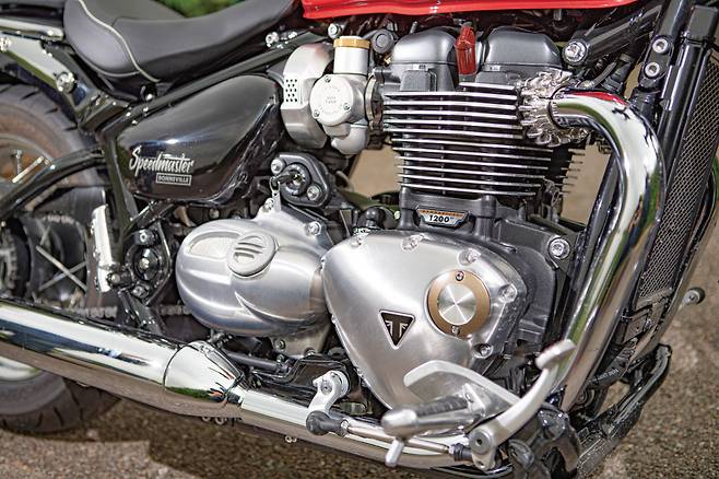 클러치 레버를 잡고 저 멀리 있는 기어 레버를 발로 툭 차서 1단 기어를 넣는다. 철커덕하는 소리와 함께 투박하게 기어가 맞물린다. 덩치에 어울리지 않게 클러치가 가벼워 피로감이 적다. 툴툴거리는 배기음을 내며 앞으로 나아간다. 270˚ 위상차 크랭크의 박자감도 더 또렷이 느껴진다. 스피드 마스터엔 바버 튠의 1,200cc 하이-토크 엔진이 적용된다. 최대 토크는 4,000rpm에서 106Nm T120과 비교해 단 1Nm 높아졌을 뿐인데 토크가 더 풍성하게 다가온다.