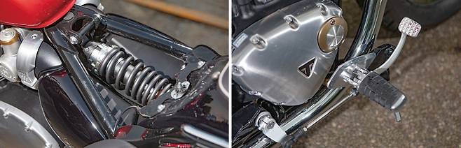 하지만 90mm 트래블의 프런트 포크, 72mm의 리어 샥은 강한 충격을 만나면 쉽게 한계를 드러낸다. 더구나 리어 서스펜션은 시트 바로 아래 위치한 탓에 그 충격을 고스란히 라이더에게 전달한다. 크루저에게 기대하게 되는 수준의 감각을 주지 못한다. 하지만 이런 서스펜션 구조는 스피드마스터만의 독특한 주행감각을 완성했다. 짧은 트래블로 노면에 딱 달라붙어 달리는 느낌을 주며 리어 서스펜션은 노면의 정보를 세밀하게 전달한다.