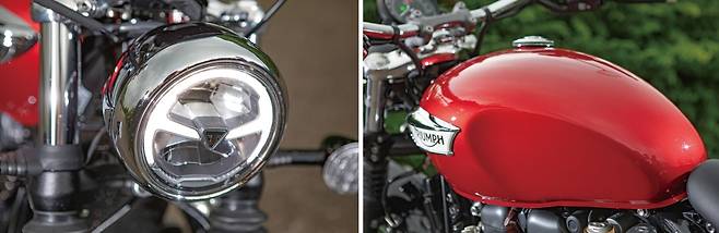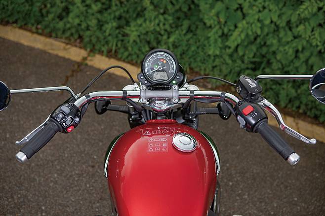 시트에 앉아 핸들 바를 잡는다. 여유로운 포지션에 조급하게 시동을 걸고 출발하기보다 예열을 하며 잠시 휴식을 갖는다. 연료 탱크와 시트 사이에 공간을 두어 프레임을 드러낸 클래식한 설정이 마음에 든다. 연료탱크를 내려다보니 낮고 넓은 표면에 푸른 하늘과 나뭇잎이 비친다. 바이크의 즐거움은 빠르게 달리는 데만 있지 않다는 것을 다시금 느낀다.