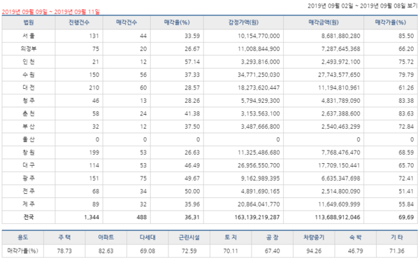 지난주(9~11일) 전국 부동산 경매 낙찰가율(감정가 대비 낙찰가 비율)은 전주보다 1.07%포인트 하락한 69.69%를 기록했다. 아파트 낙찰가율은 5.79%포인트 내린 82.63%, 단독주택 낙찰가율은 7.76%포인트 상승한 78.73%였다. 다세대주택 낙찰가율은 2.01%포인트 떨어진 69.08%로 나타났다.