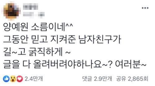 8일 오후 이동민은 자신의 페이스북에 "양예원 소름이네. 그동안 믿고 지켜준 남자친구가 길고 굵직하게 글을 다 올려버려야 하나요? 여러분"이라는 글을 올렸다.
