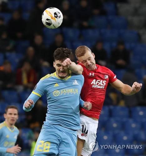 epa07979206 AZ Alkmaar Dani de Wit (R) fights for the ball with Yuri Pertsukh (L) of Astana during the UEFA Europa League match between FK Astana and AZ Alkmaar at the Astana Arena stadium in Nur-Sultan, Kazakhstan, 07 November 2019. EPA/IGOR KOVALENKO