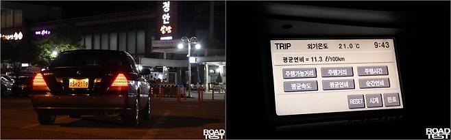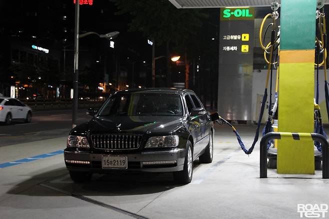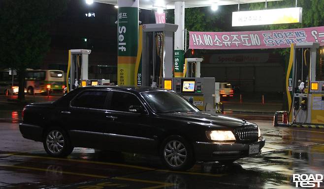 한참을 달려, 시계가 밤 11시 50분을 가리킬 때 즈음 드디어 출발 전 기름을 넣었던 서울 한 주유소에 다시 도착했다. 누적 주행거리는 총 780㎞, 주행 환경은 고속 주행이 압도적으로 많았으며, 승차 인원은 세 명이었다. 연비는? 트립컴퓨터는 9.17㎞/L를 가리켰고, 풀투풀 계측은 총 83.972L를 소모해 9.28㎞/L 연비를 기록했다. 결국 고속주행에서도 에쿠스는 10㎞/L 벽을 넘지 못했다. 왕복 유류비는 약 12만 원. 바로 이전 차였던 기아 포르테쿱(약 6만8,000원)보다 두 배 조금 덜 들었다.