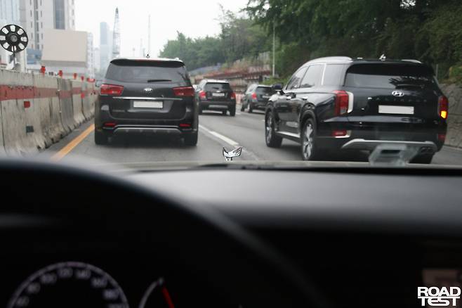 80L 연료통을 가득 채운 후 출발. 주말 서울 도심 빠져나가는 길은 언제나처럼 막힌다. 당연히 효율은 뚝뚝 떨어진다. 이날 트립컴퓨터 평균 연비 5㎞/L를 처음 봤다. 1,965㎏, 즉 2t에 육박하는 덩치를 이끌고 가다 서다 반복하는 상황이니 이해는 한다.