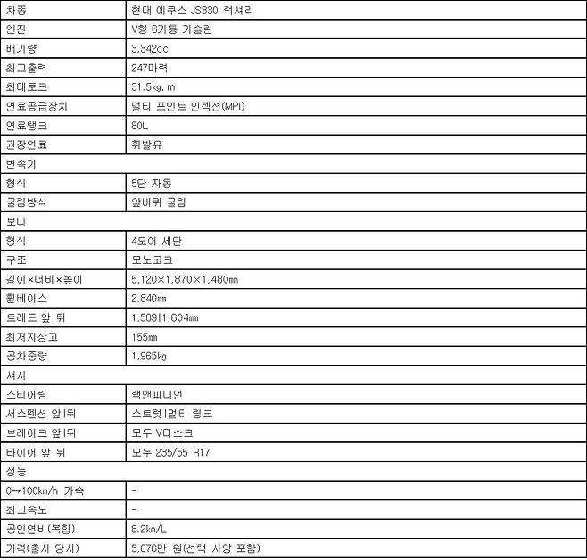 먼저 간략한 차 소개부터. <올드 롱텀> 주인공은 지난 2월 클래식카로 간직하기 위해 가져온 2007년식(후기형) 1세대 에쿠스다. V6 3.3L 가솔린 엔진을 얹은 JS330 모델로, 공인 연비는 8.2㎞/L다. 지난 네 달간 누적 연비 L당 7.4㎞를 기록하며 화끈한 먹성을 보여줬다.