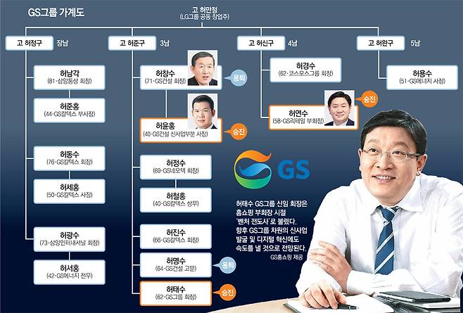 허 회장과 함께 셋째 동생인 허명수 GS건설 부회장(64)과 5년간 ㈜GS 대표이사를 맡았던 정택근 부회장(66)도 경영 일선에서 물러난다. 그 대신 허씨 일가의 젊은 얼굴이 승진 대열에 올랐다. 허 신임 회장의 사촌이자 고 허신구 회장의 차남인 허연수 GS리테일 사장(58)이 부회장으로 승진했다. 또 허창수 회장의 장남인 허윤홍 GS건설 부사장(40)이 1년 만에 사장으로 승진해 GS그룹 4세 경영이 본격화되고 있다는 분석도 나오고 있다.