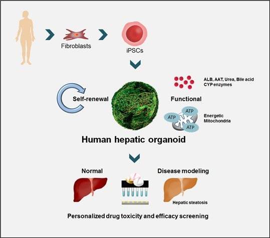 생명연 연구팀은 두 기술의 장점을 접목, 환자맞춤형의 인간 전분화능 줄기세포를 이용하면서, 3차원 오가노이드 형태의 간세포 모델로 분화시키는 기술을 완성했다.