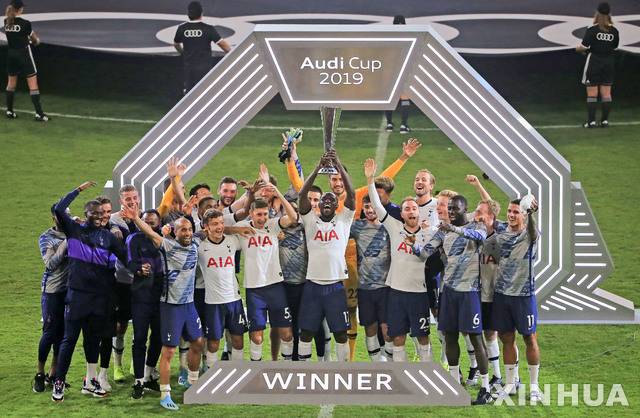 【뮌헨=신화/뉴시스】손흥민(뒷줄 왼쪽 다섯 번째)를 비롯한 토트넘 홋스퍼 선수들이 7월31일(현지시간) 독일 뮌헨의 알리안츠 아레나에서 막을 내린 바이에른 뮌헨과의 2019 아우디컵 결승에서 우승, 트로피를 들고 환호하고 있다. 2019.08.01.