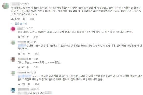 그러나 댓글엔 실제 배달원들이 메세나폴리스에서 겪은 경험담들이 이어지면서 논란이 증폭됐다. 한 네티즌은 자신을 해당 아파트에 자주 가는 배달원이라고 소개한 뒤 “영상 속 입구 말고 돌아서 가면 경비원이 문 열어주시고 카드키로 엘리베이터 찍어준다”고 설명했다. 그러면서도 “저기 처음 배달 갔을 때 들어갔다가 40분 갇혀있었다”며 “나올 때도 카드키가 필요한 입구였다”고 부연했다.