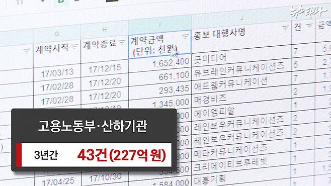뉴스타파는 김동철 바른미래당 의원실에서 입수한 고용노동부(산하기관 포함)의 3년치 광고·홍보비 관련 자료에서 턴키계약 사례를 확인해 봤다. 먼저 고용노동부와 산하기관이 지난 3년간 총 43건, 금액으로는 227억 원에 이르는 턴키 광고·홍보계약을 홍보대행사와 체결한 사실이 확인됐다. 고용노동부 본부의 경우 홍보기획팀과 청년고용기획과 등 총 7개 부서가 계약 당사자였는데, 계약 내용은 대부분 ‘청년고용정책 홍보’, ‘취업성공패키지 홍보’ 같은 문재인 정부의 중점추진사업과 관련된 것들이었다.