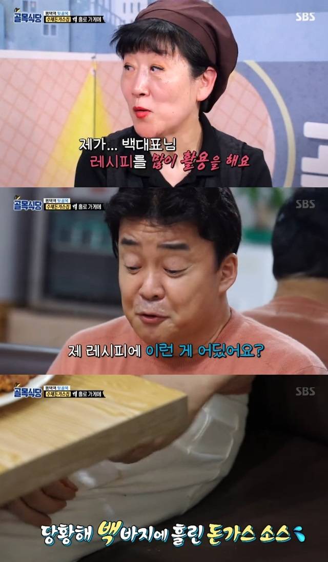 그 모습을 지켜본 돈가스집 사장은 백종원 레시피를 보고 배웠다며 “거기 파기름 내는 과정이 없다. 제가 백대표님 레시피를 많이 활용한다”고 말했다. 백종원은 “제 레시피에 이런 게 어디 있어요? 저는 김치볶음밥 이렇게 안 한다. 저는 차라리 센불에 김치와 재료를 넣고...”라며 억울해 했다.