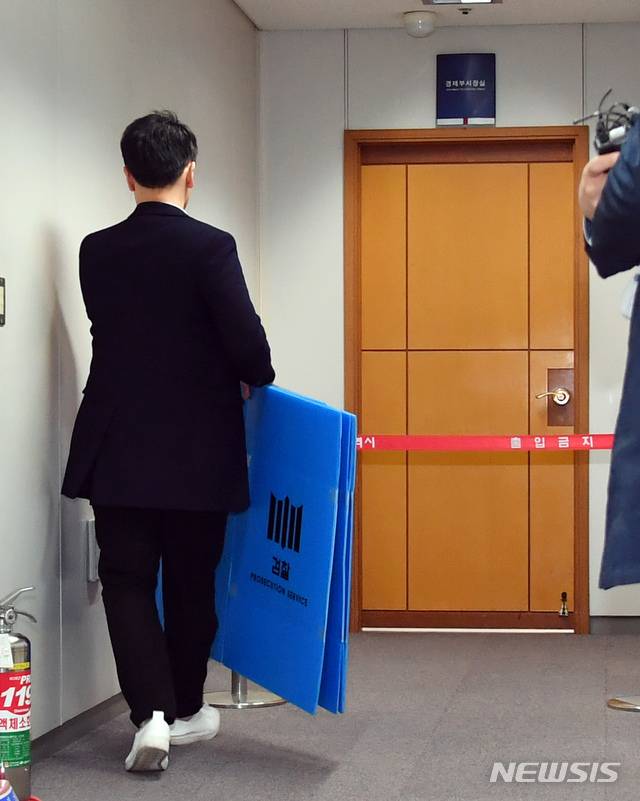 [부산=뉴시스] 하경민 기자 = 검찰이 유재수(55) 전 부산시 경제부시장 주거지 등에 대한 압수수색에 나선 19일 오후 부산시청에서 검찰 수사관이 압수품 박스를 들고 부시장실에 들어가고 있다. 2019.11.19.