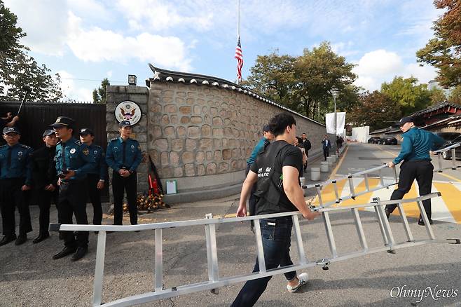 17일 오후 3시, 서울 중구 덕수궁 옆 주한미군 대사관저를 향해 한국대학생진보연합(이하 대진연) 소속 대학생 30여 명이 달렸다. 이들의 손에는 철제 사다리 2개와 손피켓, 확성기가 있었다.