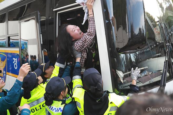 | ▲ 사다리를 이용해 미대사관저에 들어갔던 대학생들이 경찰에 의해 끌려나오고 있다. |