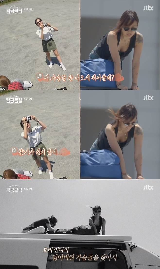 그러면서 이효리는 "내 가슴골 좀 나오게 찍어줄래? 잃어버린 가슴골 찾기가 쉽지 않네"라고 19금 농담을 해 나머지 멤버들의 웃음을 이끌어냈다.(사진=JTBC '캠핑클럽' 방송 캡처)