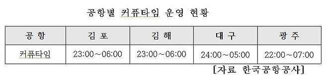 국토교통부 공항안전환경과의 남기한 사무관은 "다른 공항들은 항공편이 많지 않아 야간 운영이 불필요하거나, 운영인력이 적어서 공항 자체적으로 운영시간을 제한하는 경우여서 공식적인 커퓨타임은 아니다"라고 설명합니다.