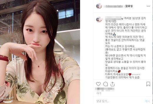 김나영 아나운서는 그러자 자신의 인스타그램에 다시금 이에 대한 생각을 덧붙였다. "저의 의견은 페미니즘이나 영화 자체에 대해서 '맞다, 틀리다'를 이야기하고 싶은 것이 아니라 저의 개인적인 생각이에요"이라면서 댓글에 감사한 마음을 드러내는 한편, "다투지 마세요"라고 당부했다.