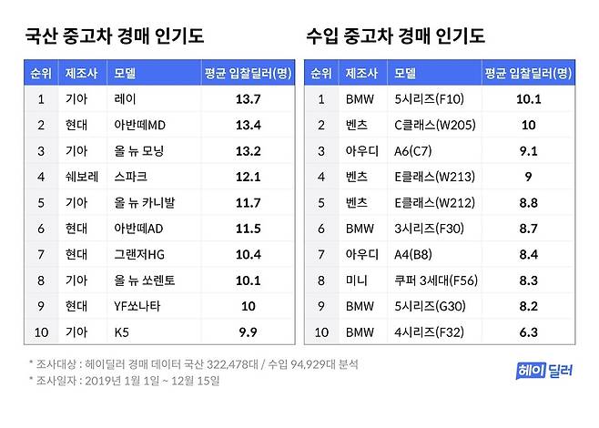 헤이딜러가 발표한 자료에 따르면, 2019년 중고차 경매에서 국산 중고차 인기도는 레이가 1위, 아반떼MD가 2위, 올 뉴 모닝이 3위를 차지했고, 수입 중고차 인기도는 BMW 5시리즈가 1위, 벤츠 C클래스가 2위, 아우디 A6가 3위를 차지한 것으로 나타났다. 이는 지난 해의 순위와 비교 시 수입 중고차 인기 순위에 큰 변화가 있었다는 것을 알 수 있다.