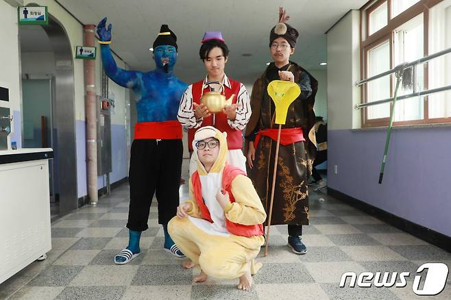 12일 경기도 의정부고등학교에서 3학년 학생들이 다양한 모습으로 분장을 한 채 졸업 사진 촬영을 하고 있다.