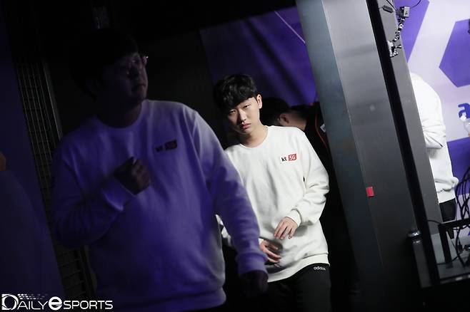 kt가 1세트 초반 불안하게 시작하며 킬을 내줬다. kt는 중반 이후 롤챔스 팀의 노련함을 선보이며 역전 승리를 따냈다. 1세트 승리를 선취한 kt '에이밍' 김하람이 차분하게 경기석을 벗어났다.
