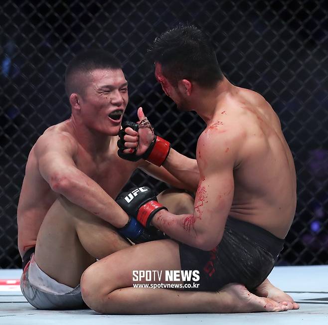 [스포티비뉴스=부산, 한희재 기자] UFC 부산 대회가 21일 오후 부산 사직체육관에서 열렸다. 밴텀급 강경호(검정)가 뤼우핑위안과 경기를 마친 후 대화를 나누고 있다.