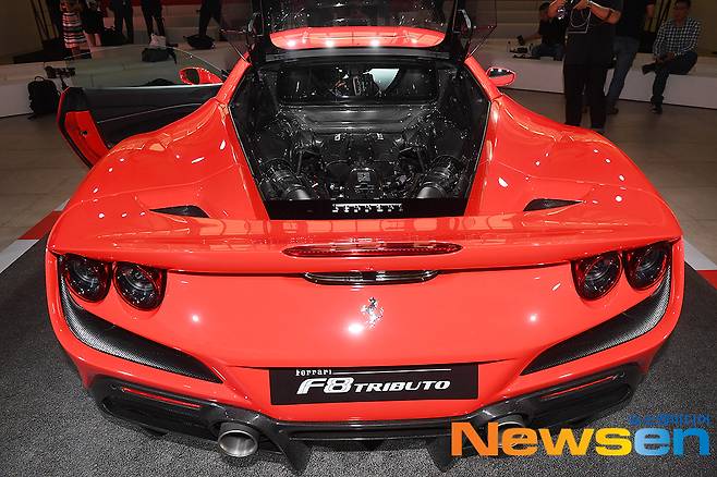 페라리(Ferrari) F8 트리뷰토(Tributo) 공개행사가 7월 18일 오전 서울 중구 남산 제이그랜하우스에서 열린 가운데 F8 트리뷰토가 전시되어 있다.