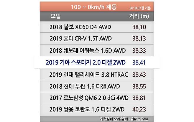 스포티지가 기록한 평균 39.5m라는 성능은 어느 정도로 보면 될까? 이는 최신 쌍용 코란도 디젤의 최단거리 40.2m에 앞서는 성능이다. 또한 제동 시스템이 스트레스를 받아 밀려나도 동급 코란도의 최단거리 보다 10cm 짧은 거리 안에 정지할 수 있다는 것을 의미한다. 특히나 보수적으로 제동거리를 설정하는 일본계 자동차들과 비교하면 성능의 이점이 더 커진다. 물론 풀옵션 모델 간 비교를 했을 때다.
