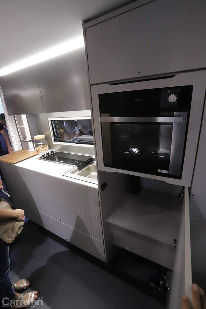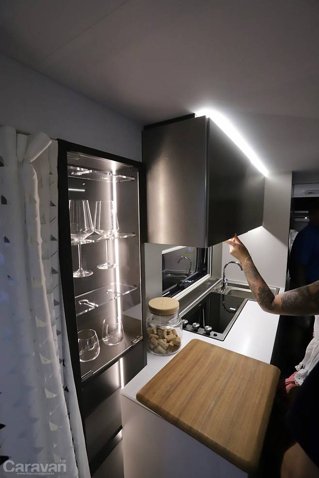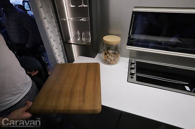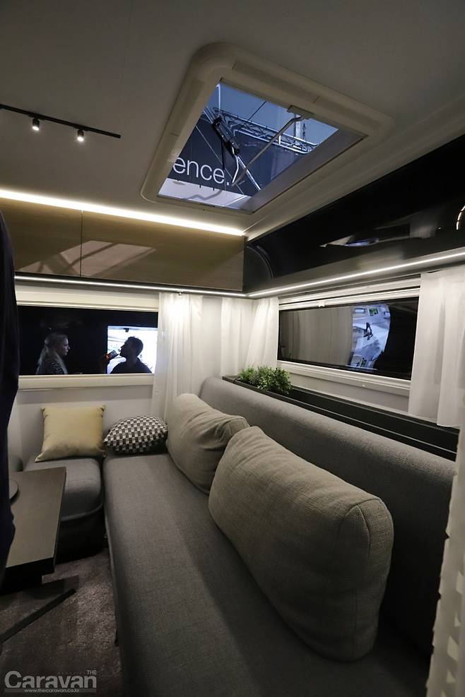 넓은 양문 출입구와 내부에 시원하게 트인 전면, 측면 창 그리고 지붕에 적용된 아드리아 고유의 파노라마 창까지 뛰어난 개방감을 느끼게 한다. 블랙과 화이트를 조화한 가구와 내부 편의시설 역시 최고의 소재와 고급스러운 디자인으로 가득 채웠다. 두툼한 전면 소파에 앉아 바라보면 침실 공간까지 일자로 고급스러운 주방과 포근한 침실까지 한눈에 들어온다.