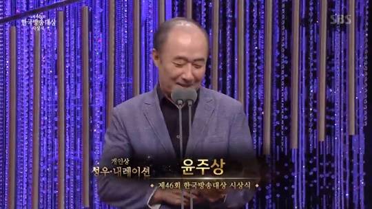 윤주상은 9월 3일 SBS 생중계된 '제46회 한국방송대상 시상식'에서 EBS ‘극한직업’으로 내레이션상을 거머쥐었다.