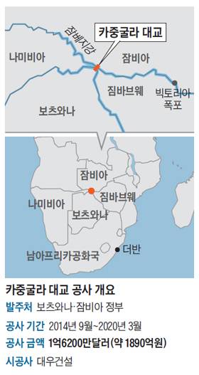 카중굴라 대교는 일본국제협력단(JAICA)의 국제 원조(援助)로 시작된 프로젝트였다. 이런 경우 원조를 제공하는 나라 기업이 시공권을 갖는 게 보통이다. JAICA 역시 일본 기업이 유리하도록 특수 공법 수행 실적을 입찰 참여 조건에 넣었다. 하지만 한국과 중국 기업은 각자 국내에서 수행했던 공사 실적을 근거로 입찰에 참여했고, 보츠와나와 잠비아 정부가 이를 인정하면서 JAICA의 계획은 무산됐다. 결국 공사비 1억6200만달러(약 1890억원)를 제시한 대우건설이 수주했다. 일본은 2억달러 넘는 금액을 제시해 가격 경쟁에서 밀렸고, 중국은 대우건설보다 500억원 이상 낮은 금액을 제시했지만 수주에는 실패했다.