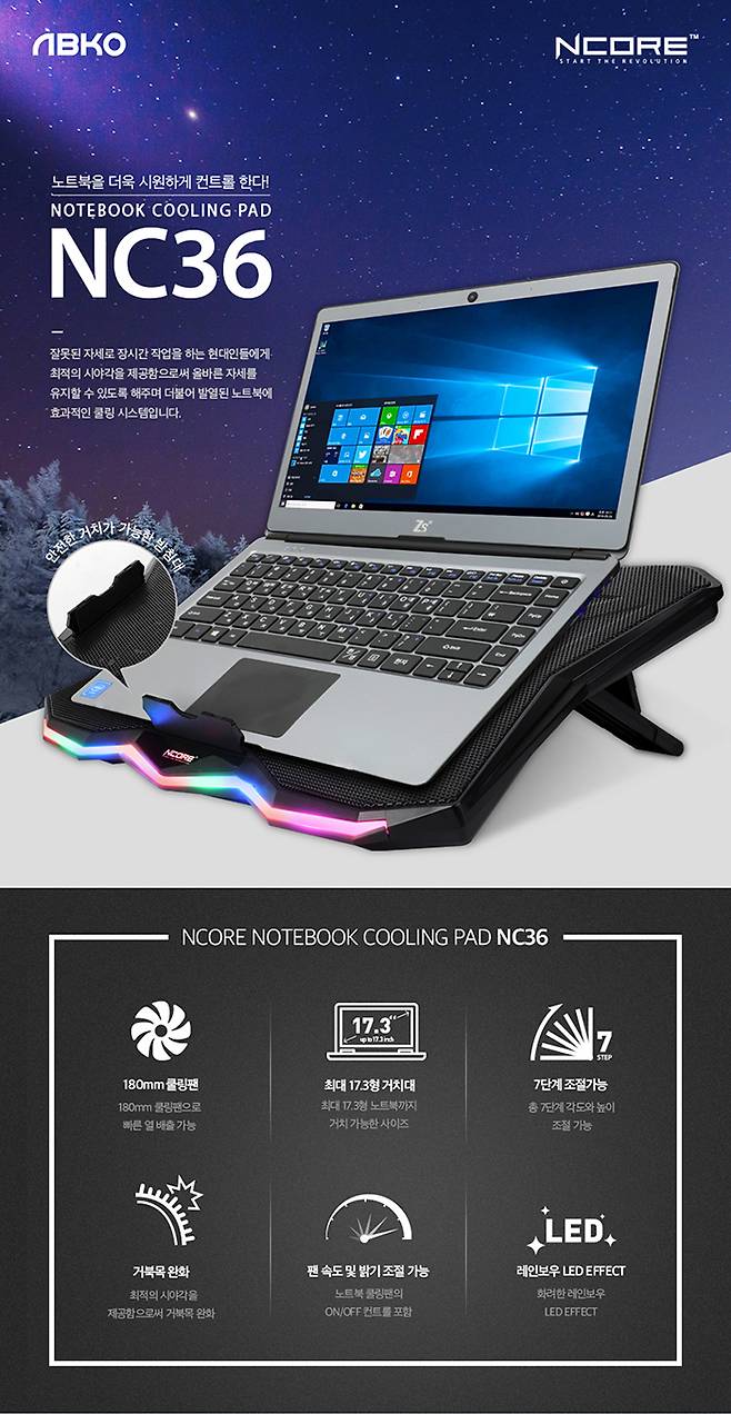 LED 효과-7단계 높이 조절. 앱코 NC36 노트북 쿨러 출시