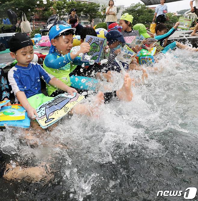 (서울=뉴스1) 오대일 기자 = 무더운 날씨를 보인 23일 서울 송파구 성내천 물놀이장을 찾은 어린이들이 책을 읽으며 물놀이를 하고 있다. 송파구는 올 여름 성내천 물놀이장에서 독서와 물놀이를 함께 즐길 수 있는 성내천 여름행복문고를 오는 28일까지 일주일 간 운영한다. 2019.7.23/뉴스1