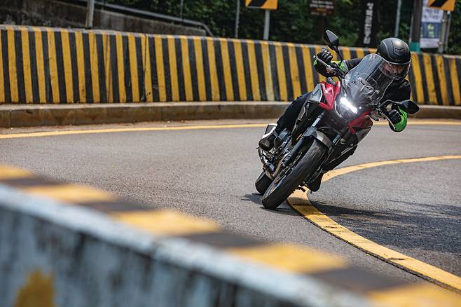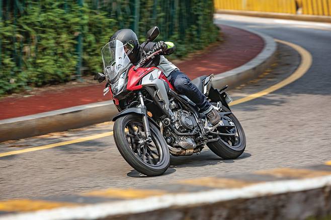 간결하고 깔끔하게 빠진 윈드스크린을 방패삼아 가볍게 출발한다. 시야를 방해하지 않으면서 공기저항을 줄여주었다. 가속과 동시에 프런트 포크가 확장되면서 남들보다 조금 더 위에서 바라보는 즐거움이 있다. 병렬 2기통 엔진은 전작보다 100rpm 높은 8,600rpm에서 47마력을 발휘하며 500rpm 낮아진 6,500rpm에서 43Nm라는 최대 토크를 낸다. 일반 라이더들이 주로 사용하는 구간의 힘을 보강하고 최대 회전수를 높여 최고출력도 증가시킨 것이다. 발휘되는 출력이 타이어와 서스펜션 움직임과 어우러져 어느 구간에서도 부드럽게 움직인다. 상체가 서게되는 포지션이기 때문에 피로가 적고 선회 시의 시야도 넓고 높다. 또한 서스펜션의 트래블이 길다는 점이 공도에서 장점으로 다가오기도 한다. 피칭 모션이 크기 때문에 제동하며 들어가 브레이크를 서서히 풀며 선회하고 가속하며 탈출하는 동작까지 느긋하여 여유롭다. 타이어가 노면을 누르고 마찰력이 이어지는 순간들이 쉽게 읽힌다. 그래서인지 절대적인 수치로 봤을 때 온로드 성향의 모델들보다 느리겠지만 CB500X 모델이 위험 부담이 적고 순간 대처가 더 쉽다. 상위 모델인 CB650R과 같은 LCD 계기반에 속도, 현재 기어, 시프트 업 표시 램프가 유독 시인성이 좋다. 달리는 동안 알아야 하는 요소를 간추려 잘 표현했다.