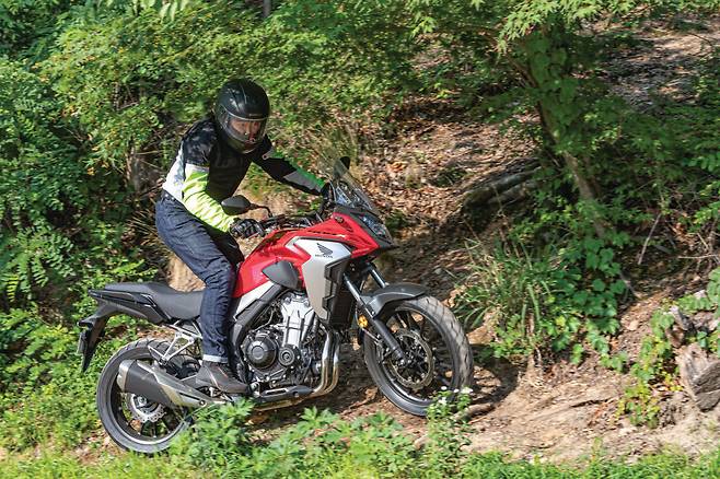 플랫폼을 공유하는 생산 전략에는 ‘같은 바이크에 외관만 바꿔서 출시한다’는 비판이 따라온다. 하지만 그렇게 단정짓기에는 CB500X가 갖춘 구성이 너무 정성스럽다. 이번 변경으로 프런트 휠을 19인치를 키웠고 프런트와 리어 휠은 Y형 스포크의 개수를 7개로 늘려 오프로드 주파성을 확장했다. 또한 프런트 포크의 트래블을 늘리고 최저 지상고를 확보해 투어링 모델다운 포지션이 연출된다. 이 모든 것이 흙과 돌이 깔린 오프로드를 달리는 것을 염두에 둔 설정이다. 혼다 미들급 500시리즈 중에서도 CB500X는 눈에 띈다. 덩치도 크고 서스펜션도 다르다. 휠, 연료탱크 디자인, 시트형상, 페어링 등 많은 부분에서 전용파츠를 사용했다. 먼지가 날리고 울퉁불퉁한 오프로드도 자신의 놀이터인 마냥 뛰어 놀 수 있을까?
