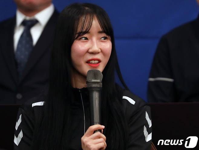 (서울=뉴스1) 황기선 기자 = 인천시청 신은주가 21일 오전 서울 중구 프레스센터에서 열린 '2019-2020 SK핸드볼코리아리그' 미디어데이에서 포부를 밝히고 있다.