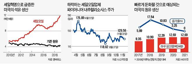 미국에너지정보청(EIA)에 따르면 미국의 하루 원유 생산량은 작년 초 935만 배럴에서 작년 말 1099만 배럴을 넘겼다. 하루 약 160만 배럴 증산됐다. 올해는 하루 130만 배럴가량 늘어날 전망이다. 최근 하루 생산량은 1200만 배럴을 웃돌고 있다.