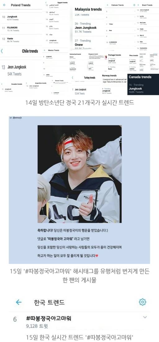 팬미팅 무대에서 뜨거운 열정과 넘치는 팬사랑을 보여준 방탄소년단 정국은 14일 'Jungkook, #JUNGKOOK, Jeon Jungkook' 으로 21개 국가 실시간 트렌드, 15일 '#따봉정국아고마워'로 한국 실시간 트렌드에 오르며 공항 출국부터 일본 팬미팅까지 3일간 세계 각국을 들썩인 글로벌한 인기를 증명했다.