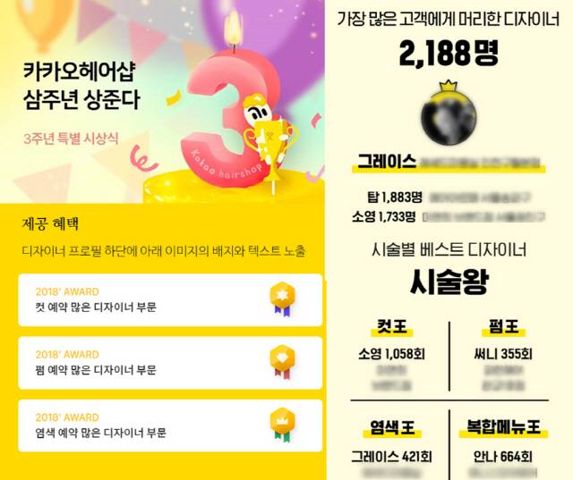 카카오는 분기별, 반기별, 연간에 나눠 예약 및 매출 우수매장을 선정해 발표한다. 지난해 인천 소재 미용실 원장이 2,188명의 고객을 유치해 매출 1등 왕관을 차지했다. 서울 광진구에서 일하는 디자이너는 커트로만 한 해 1,058명을 잘라 ‘커트왕’에 등극했다. 일단 타이틀을 얻게 되면 앱 상에서 홍보 효과를 톡톡히 누릴 수 있다. 그러나 모든 순위와 평가가 공개되고 전시되다 보니 디자이너들은 스트레스를 받기 마련이다. 한 예약 앱 리뷰 사이트에는 “저렴한 가격이라 가봤더니 머리는 마음에 안 들고, 대신 화려한 말로 영업하면서 좋은 리뷰 써달라고 부탁하더라”며 적잖이 실망했다고 쓰기도 했다.