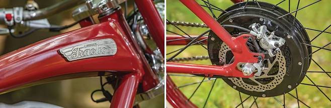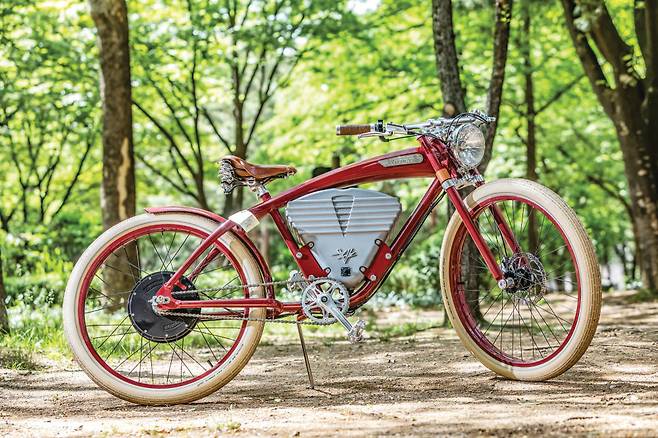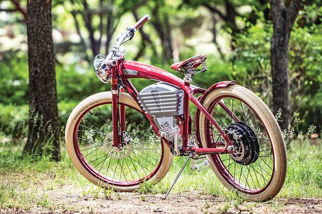 빈티지 일렉트릭 바이크는 미국 캘리포니아에서 2011년에 설립된 프리미엄 전기 바이크 전문 브랜드다. 그리고 그들이 선보인 첫 모델이 바로 이 트래커로 브랜드를 대표하는 모델이다. 생김새는 자전거를 기초로 만들어진 초기 모터사이클의 스타일에서 영감을 받아 고전적이면서도 우아한 느낌을 준다. 하지만 정말 자전거에 모터만 단 것은 아니다. 안정적인 라이딩과 충분한 강성을 위해 알루미늄 소재로 제작되는 프레임과 V형 엔진을 형상화한 배터리팩도 고전적인 샌드캐스트 방식으로 제작되는 그야말로 수제작 제품이다.