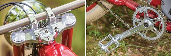 안장과 그립은 영국의 브룩스제 가죽 그립과 시트를 기본으로 장착해 퀄리티를 높이고 있다. 크랭크는 FSA 지몬디 크랭크를 사용한다. 탑브릿지와 트리플 클램프는 절삭가공 제품을 사용한다. 한눈에도 각 파츠들이 튼튼하고 고급스럽다. 트래커는 프런트 유압식 포크는 옵션 사양으로 테스트 차량에는 전후 모두 쇽이 없는 상태였다. 하지만 휠과 타이어에서 어느 정도 충격을 흡수해 주기 때문에 불편함은 거의 없었다. 사실 일반적으로 자전거들에 쇽이 없는 게 이상한 건 아니니까. 좀 더 부드러운 주행감각을 원한다면 MRP 포크를 옵션으로 장착하거나 애당초 스크램블러를 선택하는 것을 추천한다.