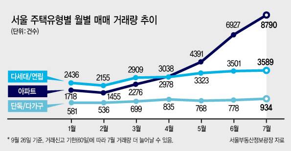 26일 서울부동산정보광장에 따르면 이날 기준 지난 7월 서울 빌라와 단독주택 거래량은 각각 3589건, 934건으로 연초 대비(각각 2436건, 581건) 빠른 증가세를 나타내고 있다. ‘부동산 호황기’였던 작년 같은 기간과 비슷한 수준까지 올라선 것으로, 거래신고 기한(60일)을 감안하면 이 숫자는 더 늘어날 가능성이 높다.