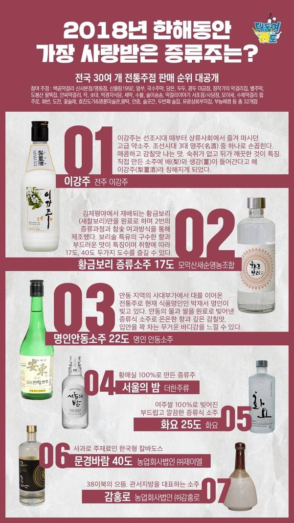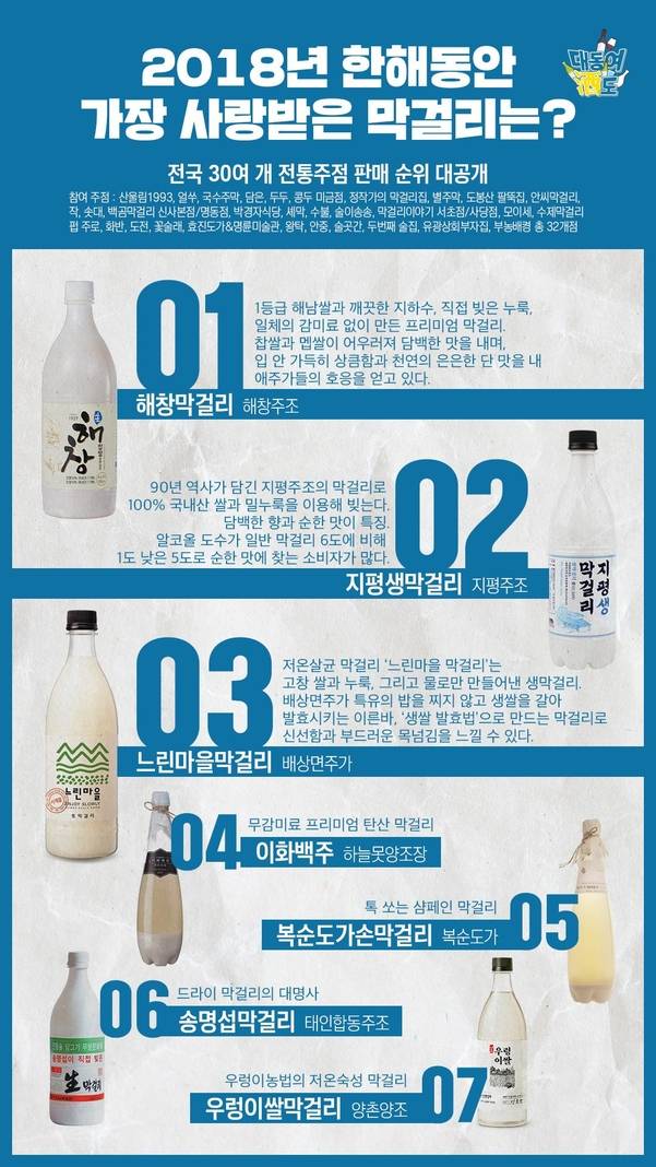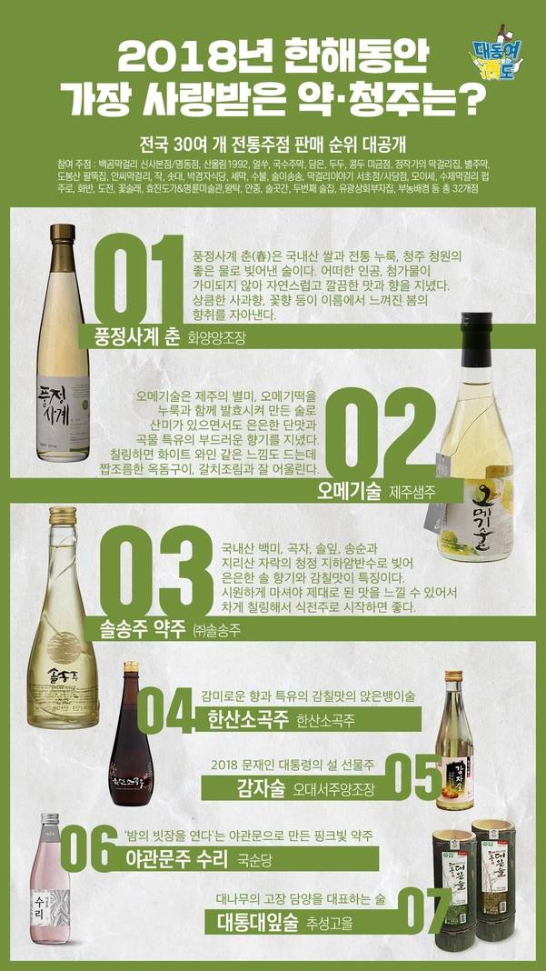 2018년 한해 막걸리 중 가장 많이 팔린 술은 전남 해창주조의 ‘해창막걸리'였다. 1등급 해남쌀과 직접 빚은 누룩, 일체의 감미료 없이 만든 프리미엄 막걸리다. 찹쌀과 멥쌀이 어우러져 담백한 맛이 일품이다. 약주(청주) 부문에서는 청주 화양양조장의 ‘풍정사계 춘'이 판매 1위를 차지했다. 상큼한 사과향, 꽃향이 봄의 향취를 자아낸다. 증류주 부문에서는 전주 ‘이강주'가 1위를 거머졌다. 쌀을 증류한 소주에 배와 생강이 들어간다고 해서 이강주로 이름붙인 조선시대 명주다.