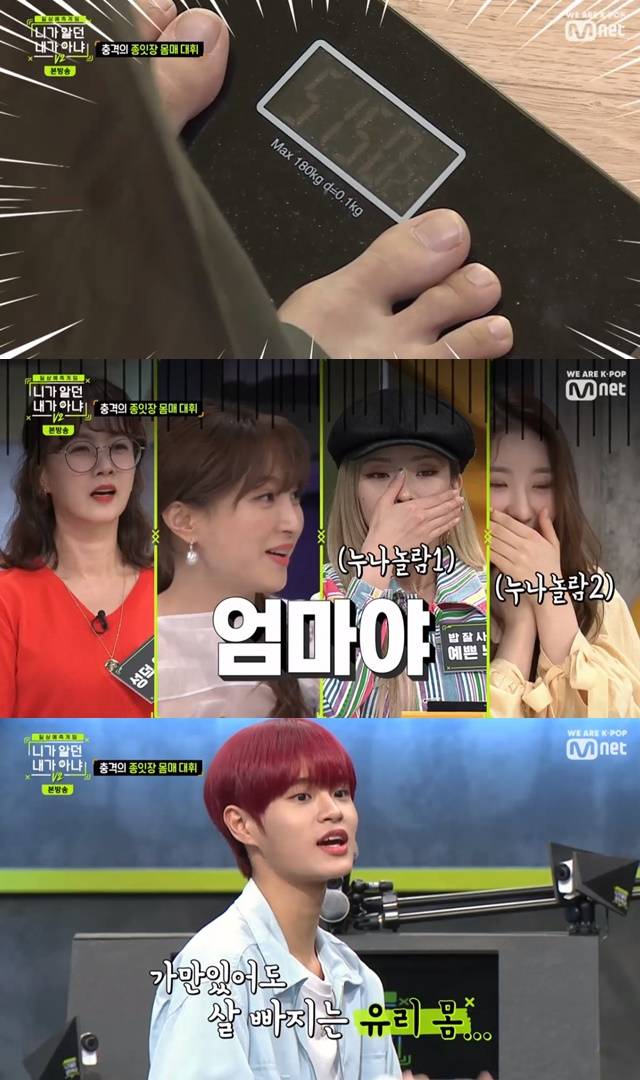 게스트로 출연한 박소현은 “허리 둘레도 17인치라고 들었다”고 덧붙였다. 이대휘는 “살을 찌우기 위해 밤에 야식도 먹고 노력 중이다”고 말했다. (사진=Mnet ‘니가 알던 내가 아냐 V2’ 캡처)